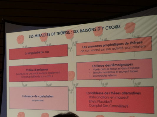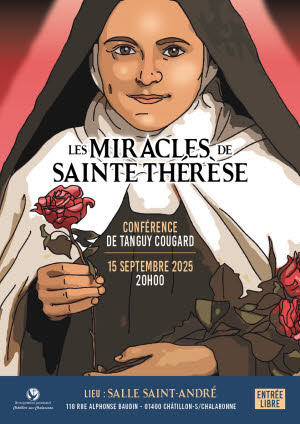 A l'occasion du centenaire de la canonisation de Thérèse de Lisieux, la paroisse de Châtillon-sur-Chalaronne vous propose une conférence de Tanguy Cougard sur les miracles attribués à "la petite Thérèse", l'une des plus grande mystique de l'église catholique. Morte en 1987, inconnue de son vivant, la publication de ses écrits posthumes entraînera une dévotion populaire et mondiale. Secours, guérisons inespérées, assistances, protections... plus de 100 ans après, des milliers de témoignages et de lettres gratifiant l’intercession de la religieuse carmélite abondent pour décrire ces phénomènes extraordinaires.